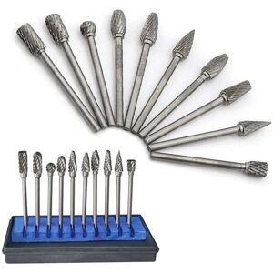 High Quality: The rotary drill bit set is made of high quality tungsten steel, processing hardness up to HRA 85, perfect for iron, steel, carbon steel, alloy steel, stainless steel, copper, aluminum, etc. Compatible with most rotary tools such as Dremel, Proxxon, Mister Tool, Einhell and similar machines. Shank diameter: 3mm. Cutting diameter: 6mm. Total length: 43.5-50mm. Multifunctional: This drill bit set can be used for engraving, chamfering, grooving, reaming, hollowing, etc. The processing efficiency is 10 times higher than the manual file tool, and almost 10 times higher than the small grinding wheel with handle. Wide Application: The rotary burr set can be used for engraving and milling soft wood, plastic and other soft materials, after carving, the surface is smooth. Portable: The rotary cutters come in a portable case, so no need to organize them. 10 Pieces Tungsten Carbide Rotary Cutter Burr Set - Grinding Head for Dremel Rotary Tools. Features: Material: Tungsten Steel.
