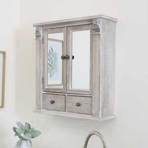 This wooden mirrored bathroom cabinet would make an excellent wall storage choice for those who prefer washed finished and natural wooden furniture. This wall unit has a traditional, vintage-inspired design. It comes with two cupboard doors, two storage drawers, and a washed finish. Ideal wall shelving for a farmhouse, rustic, country, or vintage style interior. Perfect for wall mounting in a bathroom, bedroom, kitchen, or hallway space. This item is also available in pink, cream, white, and grey. August Grove