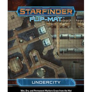 Find the horrors and wonders left behind by the galaxy’s most ancient civilizations in Starfinder Flip-Mat: Alien Ruins.One side of this mat puts heroes right into the action in a set of ruins located inside a shifting maze of high stone walls, where they’ll find the hidden ruins of a forgotten culture.This side also matches up perfectly to the red planet map presented in Starfinder Flip-Mat: Planetary Terrain Multi-Pack, allowing you to create a massive encounter space.The other side of the mat shows the interior of a dark cavern filled with the semi-active remains of a once powerful alien species.Both sides can be turned into a set piece for almost any science-fantasy adventure!A special coating on each Flip-Mat allows you to use wet erase, dry erase, AND permanent markers with ease!Removing permanent ink is easy—simply trace over any permanent mark with a dry erase marker, wait 10 seconds, then wipe off both marks with a dry cloth or paper towel.Each Flip-Mat measures 24" x 30" unfolded, and 8" x 10" folded.