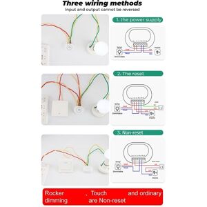 Support reset switch, touch switch, mechanical switch, dimmer switch. WIFI+Bluetooth dual-mode, faster and more stable distribution network. The Tuya solution supports speakers, speakers, and Tmall Genie, and can adjust the brightness by voice. Mini body, can be put into the bottom box, more convenient to install. After disconnection, once the WIFI is activated again, the devices connected to the module automatically connect to your WIFI network. Type: Dimming switch Voltage: 85~250V, 50-60HZ Power: 5~150W WIFI standard: 2.4GHz IEEE 802.11 b/g Notice: 1. This product only supports dimmable light bulbs (silicon controlled silicon), not bluetooth light bulbs and ordinary light bulbs 2. Please operate with the lights off when configuring 3. Long the reset switch to adjust the brightness directly. When brightening or dimming, please release the switch before operating 4. Touch switches and other mechanical switches can only be operated on and off, and cannot support adjusting brightness.
