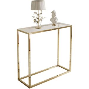 This charming console table is a real gem of a piece of furniture. Its transparent glass plate looks like a piece of pure crystal and gives any interior a sense of generosity and lightness. The golden frame complements it wonderfully and exudes opulence and luxury. The golden surface gives the console a unique shine and an elegance that attracts attention and arouses admiration. Fairmont Park Size: 78cm H x 80cm W x 30cm D