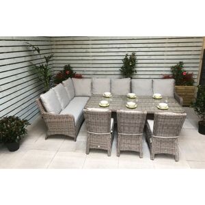Signature Weave Alexandra rectangular dining table in fine grey wicker with a glass table top 150 x 100 cm High strength powder-coated aluminium frame UV treated wicker Care Instructions: Cushion covers are showerproof but need to be stood on their ends for water to drain away. All cushions should be stored away in a dry area when not in use. Cushion covers can be cleaned with soapy water and a damp cloth that is not abrasive. We do not advise to wash or tumble dry as this may effect the showerproof properties. Do not leave any glass items/objects on the table without mats/coasters. Do not store glass on its end during assembly; please place on a flat surface on carton provided. Cover glass in extreme heat as this can magnify the heat and melt wicker. Delivery to the following postcodes are POA, please contact us before ordering - KW, IV16 and above, PA20 and above, PH30 and above. Delivery to BT, PO Isle Of Wight Postcodes & Offshore Islands is not possible