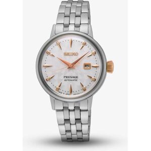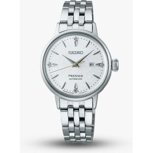 This elegant watch from the Seiko Presage Cocktail Time collection is inspired by Japan’s vibrant cocktail culture. It features a light blue dial reminiscent of the Frozen Skydiving cocktail, accented with shimmering white diamond hour markers. Paired with a polished silver bracelet, it beautifully combines Japanese precision with cocktail-inspired design. • Powered by the automatic movement with 23 jewels and a power reserve of up to 41 hours. • Presented on a silver stainless steel bracelet with push button deployment clasp. • Hardlex glass. • 34mm case width. • 50 metre water resistance.