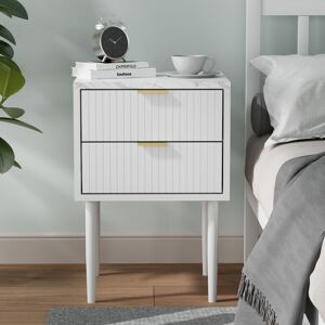 This modern nightstand adds a touch of sophistication to your bedroom ensemble. Crafted from engineered wood, it features a marble top that complements the gold-finished metal handles. The two drawers with striped textured panels offer convenient storage space for your before-bed essentials. The legs provide a stable base, while the glossy finish enhances their visual appeal. This nightstand set is a stylish and functional addition to your sleeping space, blending seamlessly with various decor styles. Blue Elephant Colour: White Marble
