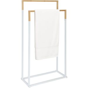 The bathroom rack allows you to hang your shower and bath towels in a space-saving manner. The two offset bars ensure good air circulation, allowing your towels to dry easily. You can also use the bath towel rack as a storage solution for clothing. The free-standing towel rack can be placed flexibly in the bathroom or guest WC. It impresses with its decorative design made of metal and bamboo rods. Towel rack in detail - Dimensions H x W x D: approx. 86 x 44 x 21 cm - Height of the lower bar: approx. 74.5 cm - Weight: approx. 1.9 kg - Material: iron Free-standing towel rack made of metal - Two offset bars enable effective drying - Suitable for hanging hand towels, bath towels, or clothing - Decorative design with natural bamboo rods - Freestanding bath towel rack can be positioned flexibly - Ideal for bathrooms and guest WCs Included in Delivery - 1x towel dryer in parts - Includes instructions and assembly materials - Decorative items are not included in the delivery