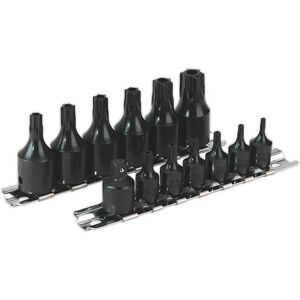 Drop-forged one-piece Chrome Vanadium steel, specially hardened and tempered. Security TRX-Star* type head. Finished in black oxide for corrosion resistance. Supplied on two rails. Features & Benefits: • Drop-forged one-piece Chrome Vanadium steel, specially hardened and tempered. • Security TRX-Star* type head. • Finished in black oxide for corrosion resistance. • Contents: 1/4"Sq Drive; T10H, T15H, T20H, T25H, T27H, T30H, 3/8"Sq Drive; T40H, T45H, T47H, T50H, T55H, T60H, Minimum/Maximum Length; 25/40mm, 3/8"Sq(F) x 1/4"Sq(M) Adaptor. • Supplied on two rails. • Lifetime guarantee*. • Model No. AK5585 Specifications: Model No AK5585 Brand: Premier Contents: 1/4"Sq Drive; T10H, T15H, T20H, T25H, T27H, T30H, 3/8"Sq Drive; T40H, T45H, T47H, T50H, T55H, T60H, 3/8"Sq(F) x 1/4"Sq(M) Adaptor Drive: 1/4" & 3/8"Sq Maximum Length: 40mm Minimum Length: 25mm Nett Weight: 0.37kg
