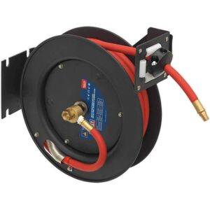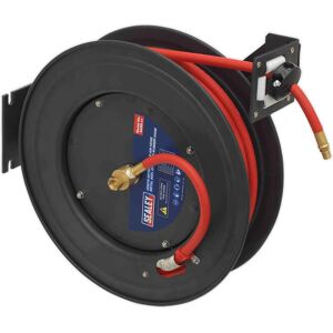 Heavy-duty polypropylene casing. Double braided polyurethane hose fitted with 1/4"BSP female inlets and 1/4"BSPT male outlets. Features auto-layering mechanism which distributes air hose evenly back into the reel housing preventing it from jamming. Supplied with mounting bracket and fixing kit for attachment onto walls or ceilings. Features & Benefits: • Heavy-duty polypropylene casing. • Double braided polyurethane hose fitted with 1/4"BSP female inlets and 1/4"BSPT male outlets. • Features auto-layering mechanism which distributes air hose evenly back into the reel housing preventing it from jamming. • Supplied with mounting bracket and fixing kit for attachment onto walls or ceilings. • Model No. SA813 Specifications: Model No SA813 Brand: Sealey Hose Size (ID/OD): Ø8/12mm Hose Type: Double Braided PU Inlet Size: 1/4"BSP Length: 10m Maximum Pressure: 150psi Nett Weight: 3.22kg Outlet Size: 1/4"BSP