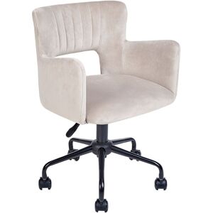 Upholstered Desk Chair with Armrests. This swivel office chair is all about modern design, it presents a retro-inspired look mixed with functionality, high-quality materials and comfort. A padded seat comes with armrests and a backrest with eye-catching cut-out detail. The smooth velvet upholstery gives depth and sheen to the colour. The vertical tufting on the inner back lends the chair an elegant touch. Details: Product Type: Office Chair Style: Modern General Color: Beige, Grey, Black Shade: Taupe Material Type: Fabric Main Material: Velvet Additional Material: Iron Legs material: Metal Seat Material: Fabric Material Composition: 100% Polyester 360 Swivel: Yes Adjustable Parts: Seat Height Armrests: Yes Finish: Chromed Leg Caps/ Pads: No Tilting: No Dimensions: Armrests Height: 24 cm Depth: 62 cm Seat Height: 39-47 cm Width: 62 cm Height: 71-79 cm Seating Surface: 44x44 cm Weight: 7 kg Weight Capacity: 130 kg Offer Includes: 1 x Chair Key Features: 360° Swivel, Smooth Rolling