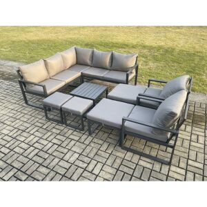 This aluminium Outdoor garden furniture set can be used both indoors and outdoors, with high quality aluminium Frame construction for sturdiness and long lasting. it can also be placed on the patio or balcony, The design of this patio lounge sofa set is a perfect blend of country chic and modern minimalism, adding an elegant touch to your house. Set Dimensions: 1 x Left Sofa with single armrest: 125W x 70D x 78H cm; 1 x Right Sofa with single armrest: 125W x 70D x 78H cm; 1 x Corner Sofa70L x 70W x 78H cm; 3 x Chair Size: 74L x 70W x 78H cm; 1 x Big footstool 60L x 60W x 35H cm; 2 x Fully Assembled Stool Size: 40L x 40W x 36H cm; 1 x Square Coffee table : 60L x 60W x 35H cm; Items Comes Flat Pack And Easy Assemble, Alloy Aluminium Frame With Powder Coating To Prevent The Rust, This Set Was Completely Made By Handmade, Aluminium Table Top Without Glass ,9 cm; Thick Seat Cushion With Soft Pillow Back Cushion Gives You More Comfort Move To Different Place. Pls Keep the Cushion Indoor Or With Rain Cover When Not In Use . Keep The Furniture With Rain Cover If Not Use For Long Time .the product is delivered on pallet, to kerbside only. Fimous 11 Seater Outdoor Aluminium Garden Furniture Set Corner Lounge Sofa Set with Square Coffee Table Chair 3 Footstools Dark Grey