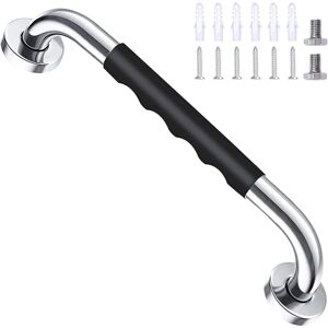 Description: The handle consists of a wall handle made of stainless steel with a non-slip grip look made of silicone, Ø 430 mm Technical data: Product categories: Bathtub handle Color: Black + Chrome Size: 30 cm Material: Stainless steel SUS304 + silicone Max. Load capacity: load capacity up to 200 kg Drill diameter: 8 MM Wall handle suitable for bathrooms, kitchens, stairs, etc., all other smooth interior surfaces They consist of an antibacterial silicone lid and are equipped with a 304 stainless steel insert, which ensures greater robustness Delivery contents 1 x bathtub handle 2 x anti-slip closure Fastening material (screws and dowels)