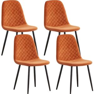 GENERAL DESCRIPTION This chair features a soft velvet fabric with a comfortable padded seat and strong metal legs. Its design includes a slight curve in the back for added comfort. It is versatile for use as dining chairs, side chairs, reception chairs, or coffee chairs, making it suitable for dining rooms, kitchens, offices, and restaurants. TECHNICAL SPECIFICATIONS Color: Orange Material: Velvet and Metal Legs Size: 44.5 x 39 x 86 cm (17.32 x 15.75 x 33.27 inches) Package Includes: 4 chairs per box Assembly: All installation parts and instructions included INSTALLATION Assembly is required. Follow the installation manual carefully to avoid issues such as shaking. Contact customer service for assistance if needed. OTHER INFORMATION Please allow a 10% color difference due to screen resolution variations. An error of 1-3 cm may occur as each batch of the product can differ.