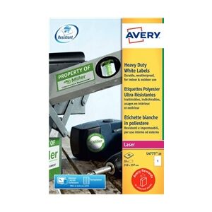 These hard-wearing labels are designed for outdoor, industrial and warehouse use. Offering durable adhesion on almost any surface, including glass, polished surfaces, plastic and metal, they are tear-proof, UV resistant, waterproof and temperature proof between -20 degrees Celsius and 80 degrees Celsius. Designed for your laser printer, these labels are fully customisable using Avery's free software and templates to keep things clear and organised in even the toughest of conditions. This pack contains 480 labels with 20 sheets and 24 each sheet. Redeem an Avery voucher or a shopping voucher worth up to ��15! (averyrewardsclub.co.uk).