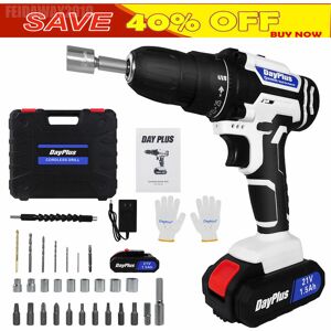 Two 1500mAh Lithium-lon battery charges 1.5 hour charge time reduces project delays so you can finish without delay! 26 Piece Accessory Kit includes all the necessary drill bits, ideal for everyday screwing tasks. Drill stands firm on it's base so you can grab it and get started. 25 + 1 torque selector slip control ring prevents over tightening or stripping of screws or over-drilling. LED lights help in dim places with little lighting. Specification: Rated Voltage: 21V Size: 32*9.5*25.7cm Weight:2.6kg Max torque(Hard tightening application):45Nm Battery: 2 x 1500mAh Lithium-lon Speed: 0-400rpm/0-1400rpm Max drilling capacity (wood): 23mm Max drilling capacity (steel): 10mm Torque setting:25+1 Chuck diameter: 0.8-10mm Max torque diameter:6mm Charge Time: about 1.5Hrs (100%Battery) Working time: about 1.2Hrs (100%Battery) Package Includes: 1 x Blue Cordless Screwdriver with 2 batteries 1 x English User Manual 5 x Drill bits 10 x Screwdriver Bits 1 x Double Ended Bits 9 x Sockets 1 x