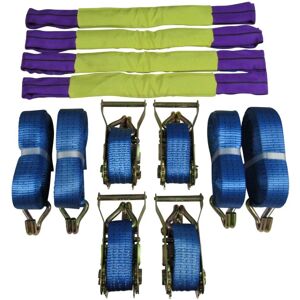 Specifiations Width:35MM Length:4 Metre Minimum Breaking Load:3 Tonne Factor Of Safety:2:1 Material:100% Polyester Product Code:SFRLPACK35I/4 Product Weight:5.7kg Ratchet Recovery Alloy Wheel Straps Our range of vehicle recovery kits are used to safely secure a vehicle to a trailer for transit. These come with soft round slings and sheathing to protect alloy wheels from damage during transportation. The ratchet handles are a short wide version for easy tightening of the straps when securing the vehicle down on the trailer. Strong & Robust Bright Hi Visibility Webbing The soft webbing which is made from 100% polyester, is high vis yellow in colour. This stands out clearly from the rest of trailer when in use, reassuring you that the straps are in place. The kit contains the following in total: * 4 - Short Wide Ratchet Handles with Claw Hooks & High Vis Yellow Webbing. * 4 - 0.5M EWL Purple Round Slings in an orange protective wear sheave. * 4 - Hi Vis Yellow Tail Ends with Claw Hooks.