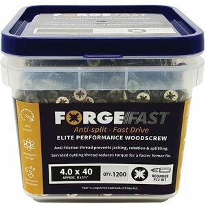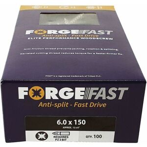 Size: 6.0 x 80mm. Box quantity: 100. These ForgeFix ForgeFast Wood Screws have a universally accepted, Pozi compatible drive. They have 6 underhead lobes for improved countersinking and reduced surface dust, and reinforced countersunk necks which improve holding power. The screws have an anti-friction thread for reduced splitting of the timber, reduced 'jacking' and spinning of joined timber and improved drawing strength. The thread is serrated for improved pull-out and reduced torque when inserting the screw. The double cutting point allows faster drilling time and reduced clogging of wood dust and is capable of piercing 0.8mm steel. The screws have a 'Elementech 400' coating providing an anti-corrosive metal finish, which lasts up to 6 times longer than standard zinc coatings. The coating is environmentally friendly and does not contain Cr6+. It is Salt Spray tested to 400 hours. The screws are suitable for interior use.