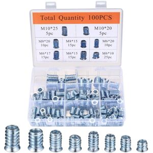 【Premium Material】: These screw nuts are made of excellent carbon steel material, the surface treatment is blue and white zinc plated, corrosion and rust resistant, sturdy and durable. 【Easy Installation】: Simply drill the correct size hole and install it with an Allen wrench or optional drive tool. 【Practical Design】: The single coarse male thread provides positive locking and offers high resistance to stripping due to twisting or vibration. 【Wide Applications】: Ideal for use in pine, plywood, composite panels, etc.; Designed for use in applications such as ready-made furniture, drawer handles, display cases, and shipping boxes. 【Package Contents】: M6 x 10mm – 25pcs; M6*15mm - 15pcs; M6*17mm - 15pcs; M6*20mm - 10pcs; M8*15mm - 15pcs; M8*20mm - 10pcs; M10*20mm - 5pcs; M10*25mm - 5pcs; 100pcs in total; makes a great addition to modern furniture combinations.