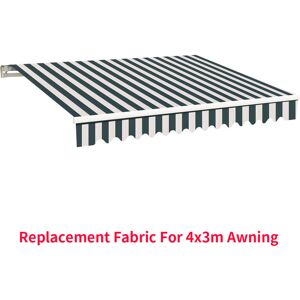 Features -This listing is for the awning replacement fabric (top cover+frill) only. -300g/m2 PU coated PE fabric, water-resistant.(Water resistance rating: 17L/m2xh ) -Colour: Green-White -Provided by the awning manufacturer, perfectly fit our awnings and others' of the same size. -Awning size is measured from side cover to side cover. Width of fabric is less than awning. -1.88x1.5m for 2x1.5m awning