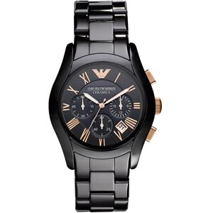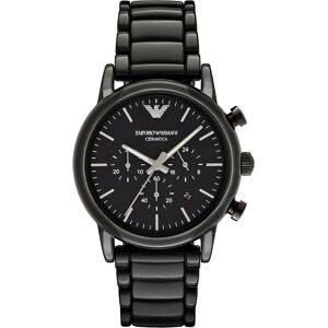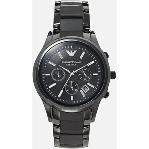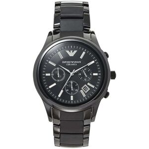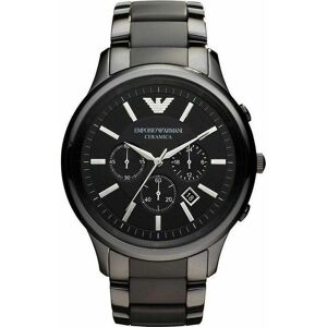 PRODUCT INFO Case Diameter: 42mm Case Material: Ceramic Water Resistant: 30 Metres Movement: Quartz (Battery) Dial Colour: Black Strap Material: Ceramic Clasp Type: Hidden Deployment Gender: Male DESCRIPTION Men's Emporio Armani stylish black ceramic designer watch. This watch is complete with a date window, three chronograph sub dials and a Japanese Quartz movement. This desirable watch fastens with a black ceramic multi link bracelet and has a black dial with silver roman numeral hour markers.