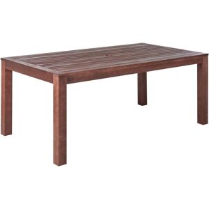 Outdoor Wooden Dining Table for 6. Add style and enhance your outdoor dining area with this rectangular table. Crafted out of solid eucalyptus wood in dark colour, this piece fits into a variety of outdoor styles, while also being durable and long-lasting. Due to its thick legs, the table is stable on different surfaces. It is also UV-resistant, which makes it perfect for your patio or garden. Details: Product Type: Garden Table Style: Industrial General Color: Brown Material Type: Wood Main Material: Eucalyptus Wood Legs material: Wood Top Material: Wood Shape: Rectangular Finish: Oiled Seats Up To: 6 People Dimensions: Width: 100 cm Length: 180 cm Height: 74 cm Weight: 39 kg Weight Capacity: 80 kg Offer Includes: 1 x Table Key Features: Modern Patio and Garden Style, Natural Wood Grains and Knots Make Each Piece Unique, Top-Notch Quality Materials, UV Resistance, To Preserve Its Quality, It Should Be Protected from Water and Rain, Uncomplicated and Self-Sufficient Assembly, Stable