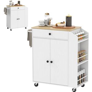 Explore the sophistication and adaptability of the HOMCOM kitchen cart. Its lots of work surface makes meal preparation enjoyable. Featuring a handy drawer and a cabinet with an adjustable shelf for extra storage of kitchen tools. The three-level spice rack and side towel bar enhance this kitchen cart's utility, making it an essential, space-saving addition for any event. Specifications: ● Colour: White, Oak ● Material: Particleboard, MDF ● Overall Dimension: 82W x 38D x 86.5H cm ● Countertop Dimensions: 60W x 38D cm ● Drawer Inner Size: 51W x 23.5D x 8.5H cm ● Cabinet Inner Size: 56W x 32.5D x 64H cm ● Shelf Size: 56W x 32.5D x 31H cm ● Spice Rack Size: 34W x 12D x 9H cm, 34W x 12D x 30H cm ● Towel Rack Size: 27L x 11W cm ● Weight Capacity: 5 kg (drawer), 5 kg (shelf), 10 kg (top), 10 kg (bottom), 5 kg (spice rack), 35 kg (total) ● Item Label: 801-375V90WT Features: ● A pull-out drawer and a two-tier cabinet organise kitchen utensils clearly ● Three-tier spice racks allow quick