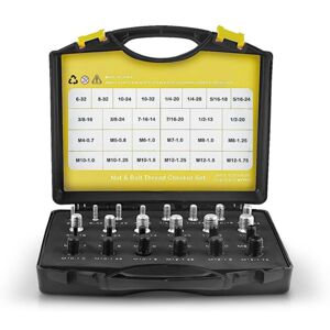 [Upgraded Thread Checking Set] Every is inserted into well cut foam that holds them firmly in place to prevent them from bouncing around in , but not so tight that you can easily remove them. Easier to use than connected nut/thread checkers, because you no longer have to carry a whole bunch of gauges to measure individual screws or nuts and can reach any tight spot. [ Before Heading to ] Just screw the nut or bolt into the screw thread gauge, it takes you a few seconds to check the size. You do not need to drive forth and back to and from the hardware and auto parts stores for check any more. Also, this nut and bolt gauge is especially well suitable for the distinguish between similar inch and metric threads. [Zinc Plated for Inch Size] Includes 14 Inch Size part numbers: 6-32, 8-32, 10-24, 10-32, 1/4-20, 1/4-28, 5/16-18, 5/16-24, 3/8-16, 3/8-24, 7/16-14, 7/16-20, 1/2-13, 1/2-20. [Black Oxide for Metric Size] Includes 12 Metric Sizes part numbers: M4x0.7, M5x0.8, M6x1.0, M7x1.0,