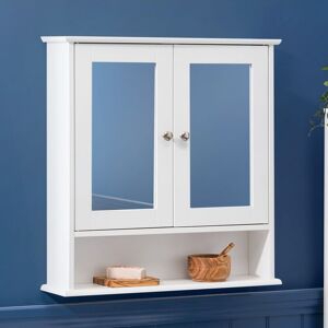 This White 2 Door Mirrored Cabinet has a white painted finish for a fresh, modern look and is wall-mountable to optimise your bathroom space. It looks stunning mounted above a sink with mirrored doors to spruce yourself up and shelves to store your essentials. Two Mirrored Doors No bathroom is complete without a mirror and the great thing about this cabinet is that it has two. Perfect if two of you are getting ready or brushing your teeth at night. Internal Storage Shelves Designed with silver-coloured handles on its cabinet doors and metal hinges to easily open and close. Contains two levels of storage to easily store and organise belongings. Open Storage Shelf The cabinet also features a hanging shelf at the bottom to provide an additional storage space. It also looks fantastic decorated with objects to brighten your bathroom space. Tongue & Groove Panels Mirrored cabinet is made from durable MDF with screw holes hidden on the inside for a smooth outer finish. Its look is lifted by