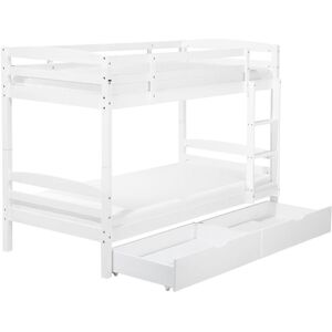 Wooden High Sleeper Bed. Ultra-functional bunk bed, fun and comfortable sleeping place for children’s or youth room. Made of robust pine wood construction with narrow slatted rails ensures maximum safety while the ladder is easy to climb. With its classic design frame painted in white, the bed blends well with any modern, minimalistic or coastal interior style. The recommended height for the top bunk mattress is less than 13 cm so that rails ensure maximum safety. Details: Product Type: Kids Bed Style: Scandinavian General Color: White Material Type: Wood Main Material: Pine Wood Fabric Upholstered Back: No Storage: No Dimensions: Width: 97 cm Length: 208 cm Height: 147 cm Sleeping Surface: 90x200 cm Weight: 44 kg Weight Capacity: 150 kg Offer Includes: 1 x Bed Frame, 2 x Slatted Frame (15 Rolled Slats), 1 x Ladder, Not Included: Storage Drawers, Not Included: Mattress, Bedding and Cushions Key Features: Shock-absorbing Slatted Bed Base Offers Perfect Support, Minimalistic,