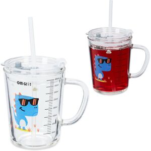 The children's drinking cup set charms with its cool dino in glasses motif and is as cute as it is practical. Both glasses have handles, lids and straws, making them particularly easy to handle. If you don't want to drink with a straw, simply use the separate drinking opening in the lid, which - just like the straw opening - can also be easily closed. After use, the glass cups can be cleaned in the dishwasher. Drinking glass for children in detail - Dimensions with lid and handle H x W x D: approx. 12 x 12.5 x 9.5 cm - Volume: approx. 400 ml - Weight: approx. 400 g - Material: Glass, ABS, silicone - Colour: Transparent, blue - For temperatures between -20 and 100°C - Maximum temperature difference is 38°C - Glasses without lid and straw are microwaveable Glass with lid and straw - Cute dinosaur in glasses motif is perfect for children - With handle for easy holding of the glass - Measuring scale gives an overview of the current filling quantity - Lid with opening for straw and extra