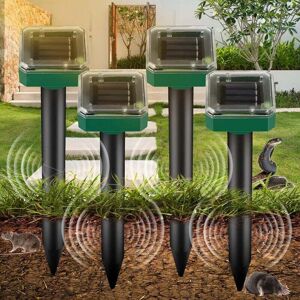 Product Description. Safe Ultrasound: The solar ultrasonic pest repeller is effective against rodents such as cockroaches, rats, snakes and other pests. It stimulates the central nervous system of rodents by emitting 400-1000Hz sound waves that it emits and vibrates every 30 seconds. It is very effective in eliminating moles and rats and will not harm humans, pets or poultry, making it ideal for gardens, farms and greenhouses. Energy-saving and Waterproof: Thanks to solar energy, no additional batteries are needed and can save a lot of energy. The installation is completely wireless and hassle-free. It is made of high-quality and environmentally friendly materials, IP65 waterproof and does not stop even in the rain. Safety and Protection: Made of durable ABS plastic and corrosion-resistant aluminum, it is safe and chemical-free. No radiation, chemicals or odor, safe for humans and our pets. The green outer cover makes it easy to hide among plants and can also be used as a garden