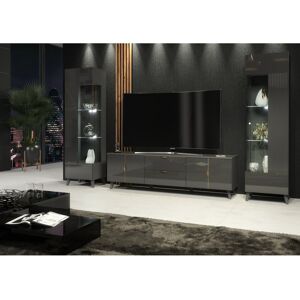 This living room set features a TV unit and two display cabinets. These are characterised by milled front panels and doors in either high gloss graphite grey or white, with a body (top, sides and inside) in matt graphite grey or white, brushed gold handles, and matching feet. The TV unit includes two cupboards and two drawers for extra storage. Suitable for TV's up to 75in. The display cabinets feature a glass fronted door that can be assembled to open to the left or right. The display area has two glass shelves and a wooden shelf above and below, for additional storage. LED lights are included with each display cabinet only (no LED lights in TV Stand). LED lights are mains powered with a UK power adapter. The foot switch is used to turn them on and off. Due to the nature of glass shelves, where purchased, white LED lights will have a green hue. Note that these are flatpack items and will require assembly. Picture instructions, and supplementary notice are included, and should be looked over carefully, prior to attempting assembly. Furneo Colour: White/Blue
