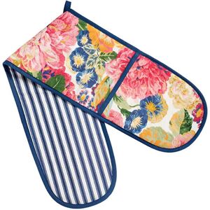 The Sanderson Very Rose & Peony Double Oven Glove is made from 100% cotton with a polyester filing to help protect hands from hot pots and pans. The outer side of the double glove features dramatic floral blooms with a strong contemporary design with pockets for hands and a navy blue trim which includes a loop for easily hanging on a hook for safe keeping. The inside of the double oven glove is navy striped for a modern look. The Sanderson Very Rose & Peony Double Oven Glove is suitable for machine washing at 40°C following the manufacturers guidelines. Size: 94(L) x 20(W)cm.