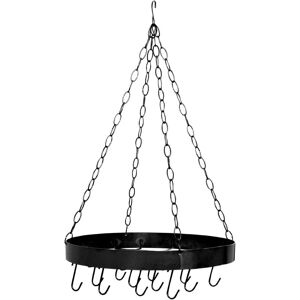 Keep pots, pans, and utensils at hand with this round ceiling rack. It hangs safely from the ceiling by four strong metal chains, their matte black finish coordinating with the round rack. Twelve metal hooks are attached to the rack's latticed base, offering plenty of storage and display potential.