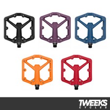 Size specific enthusiast-level platform pedal provides optimal shoe/pedal interface. Details Optimal surface area Minimal profile 16mm thin 10 adjustable pins per side for grip Premium bearings and seal system Stamp small recommended for shoe sizes: 4-9 UK // 37-43 eu Stamp large recommended for shoe sizes: 9-14 UK // 43-49 eu Specs adjustable pins 10 per side body material A380 Aluminum endcap T15 footprint small size footprint large size 100mm x 100mm 114mm x 111m     inner bearing type Igus Bearing max rider weight No restriction outer bearing type Double Cartridge Bearing shoe size US 5-10 // EU 37-43 spindle material Forged SCM 415 Chromoly Steel warranty 5 years weight small weight large 439g per pair 494g per pair