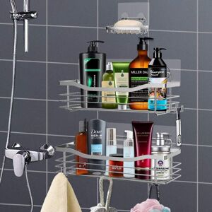 You can place your shower gel, shampoo, conditioner, shaving cream, soap and body lotion on the two shower caddies. Place your soap or sponge on the soap dish holder. The shower storage have enough space to hold your bathroom daily products. An ideal organizer for bathroom, toilet, kitchen, powder room, etc.2 side hooks for hanging razor or washcloth, 3 front hooks for hanging sponge or towels. Shower caddy is easy to take down from the adhesives. Convenient for you to move the bathroom shelf to wherever you want.Stainless steel material, ensuring beauty, sturdy and durability. Rareweaves