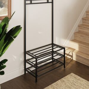 Infuse your home with the industrial charm of this black metal hallway storage rack. Skilfully constructed from durable black metal, this rack marries functionality and style, making it a perfect addition to a busy hallway. Featuring three lower shelves, it offers ample space to neatly store shoes and bags, keeping your hallway clutter-free and organized. At the top, a convenient hanging rail provides an ideal spot for storing all the kids' school coats or guests' jackets, making this storage rack a practical solution for busy households. Stunning in its simplicity, this versatile storage rack requires simple home assembly. Once assembled, it stands impressively at 181.5cm tall, spans 77cm wide, and has a depth of 38cm, offering generous storage without compromising on style. To ensure safety, especially in a home with young ones, we recommend fixing this tall hallway rack to the wall. Rebrilliant