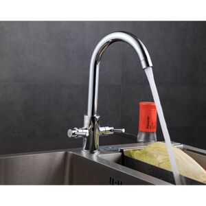 ?Specification: Tap Type: Kitchen tap Main body material: Brass Finish: Chrome Valve: Ceramic valve Control Type: Double Lever Water Feature: Hot and Cold Spout Swivel: 360 degree Design Type: Traditional/Modern Hoses: 2 x flexible hoses Mounting Type: Deck mounted Minimum pressure: 0.5bar Recommended pressure: 1bar ?Features: Dual control lever mono-bloc kitchen mixer tap 360 degrees Swivel spout makes it perfect for big twin double bowl sinks Solid brass construction, making them durable and long lasting Ceramic cartridge assures a lifetime drip free performance and allows exact control of water flow and temperature Twin Ceramic Handle: easy control of hot and cold water Hot & cold mixer mono tap ?Contents: 1 x Kitchen Mixer Tap 2 x connection hoses All fitting hardware