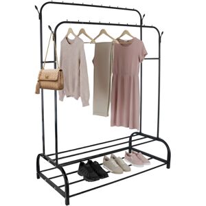 Keep your home tidy and stylish with this elegant, freestanding double coat rack made of iron. Thanks to its sturdy construction, it not only offers stable hanging space on the two coat rails with stoppers but also additional storage with two lower shelves and side hooks. Whether in the bedroom, hallway, or dressing room, this coat stand is the perfect solution for storing clothes without compromising on style. Coat Rack in Detail - Dimensions H x W x D: approx. 155 x 110 x 55 cm - Heights of the rails: approx. 106 and 126 cm - Load capacity of clothes rails: approx. 14 kg each - Load capacity of shelf: approx. 30 kg - Load capacity of hooks: approx. 2 kg each - Material: iron, plastic - Available in various colours Coat Rack with Shelves - For greater organisation in the hallway or bedroom with two rails - Stopper balls on clothes rails prevent items from sliding off - Practical surfaces for shoes and storage boxes - Different rail heights for better visibility - Modern, understated