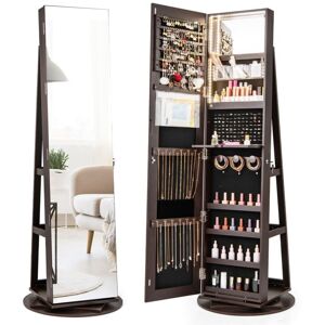 This jewelry cabinet is built with a full length mirror, large inside storage space and storage shelves on the back, making full use of the limited space. And the inside space is divided into lots of storage partitions with hooks, slots and more, which helps you organize jewelry and cosmetics well. The base is 360 rotatable so you dont need to be worried about taking items on the back storage shelves. More importantly, the mirror inside the cabinet is equipped with LED lighting that features 3 adjustable colors. And the folding acrylic table is convenient to placing makeup tools. The cabinet door is lockable with the included keys if needed. Made of premium MDF material, the stability and durability of this freestanding jewelry organizer is assured. Costway 360° Rotating Jewelry Armoire Standing Jewelry & Makeup Cabinet in Pink