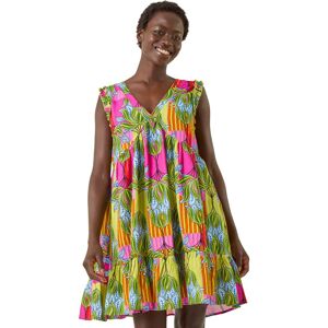 Leaf Print Frilled Smock Dress from Roman. Bring the sunshine with this delightful leaf print smock dress for the Spring/Summer season. Featuring a vibrant multi-leaf pattern, this knee-length dress boasts cute frill details at the sleeveless armholes and a flattering V-neckline. Perfect for warm days, style with sandals and a denim jacket for a fresh and chic look that exudes effortless charm!
