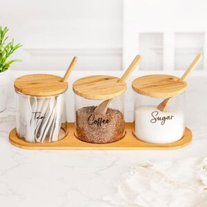 Product Overview Keep your hot drink essentials stylishly organised with this 3-piece glass tea, coffee, and sugar canister set. Complete with a wooden tray, airtight wooden lids, and matching spoons, this set is both decorative and practical. Perfect for tea bags, coffee beans, sugar, hot chocolate powder, marshmallows, or sprinkles, the clear glass jars keep everything neat and accessible while adding rustic charm to your kitchen, office, or café counter. Key Features Complete storage set: includes 3 glass jars with airtight wooden lids, 3 wooden spoons, a wooden tray, and 6 interchangeable labels Airtight lids: real wooden lids create a tight seal to preserve freshness and protect contents from moisture Convenient serving: each jar comes with a heat-resistant wooden spoon, stored neatly in lid cut-outs for easy scooping Customisable labels: 6 interchangeable stickers (tea, coffee, sugar, hot chocolate, marshmallows, toppings) for versatile use Rustic & elegant design: combination
