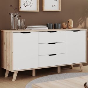 Elegant, stylish and practical - this modern sideboard is the perfect addition to your living room or dining area. With its two spacious doors and three drawers, it offers plenty of storage space for dishes, laundry and other everyday items. Made of durable wood material in light oak decor with white accents, it gives every room a fresh and modern touch. EUForte