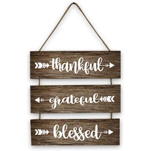 [DURABLE AND PREMIUM MATERIALS] - The wooden Gratitude Blessings ornament is made of wood with a hanging rope. Fine workmanship, simple appearance, writing, no peculiar, suitable for hanging in various places. [Easy to Hang] - Easy to hang without additional tools. Just open the package and you will get a chic and eye-catching wall plaque. Can be easily hung and removed without damaging the wall. You can hang it anywhere you like to add a rustic touch to your room. [Rustic Farmhouse Decor] - The farmhouse wall sign has a rustic texture. Warm words with thanksgiving wishes and funny arrows printed on it. The appearance is simple and elegant, the texture is simple, clean and beautiful. Create an elegant and peaceful family atmosphere for your home and use gratitude and blessings to give your family a positive and optimistic feeling. [WIDE APPLICATION] - Wooden hanging signs can be hung in bedrooms, living rooms, apartments, kitchens, offices, classrooms, porches and outdoor gardens to