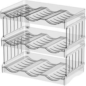 [Fits 40oz Bottles/Cups] water bottle organizer is designed to effortlessly hold up to 40oz bottles With side ridges preventing rolling, each shelf holds 3 bottles for easy access. it seamlessly fits into your space. [Stackable Design with Stable Connection] Every shelf is free-standing and stackable. And each shelf is designed with a locking device, so that shelves truly connect to each other, and the bottle shelf 't sliding off when trying to get bottles from them. [Premium Quality] Made of quality shatterproof acrylic material, this water bottle organizer is sturdy and , with a strong load-bearing capacity. You can safely fill this bottle organizer with heavy water bottles. Easy to clean, DO NOT dishwasher wash. [Versatile Use] Suitable for cabinet, kitchen cupboard, countertop, pantry, fridge, basement, bar, wine cellar, gym. This multipurpose water bottle organizer is a perfect storage solution for busy families and exercise enthusiasts to control many water bottles, coffee cups,
