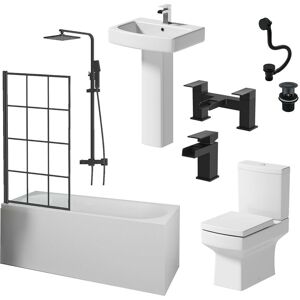 What’s Included: Affine Royan close coupled toilet & soft close seat Ceramica single-ended curved bath Black grid shower screen Affine Royan full pedestal basin Merano thermostatic square bar mixer shower with adjustable & fixed head - black Architeckt Dakota bath mixer waterfall tap - black Architeckt Dakota basin mixer waterfall tap - black Architeckt click clack bath waste with removable grid - black Architeckt slotted sprung basin waste - black Contemporary single-ended shower bath A truly versatile design, this single-ended shower bath is the perfect destination for either a relaxing bath or shower. Black grid bath screen Also featuring a stylish black grid bath screen, you can ensure any water splashes from a shower or bath are kept within the bath. 6mm thick safety glass bath screen 1400mm tall bath screen 180-degree pivot on bath screen Close coupled toilet with soft close seat This porcelain toilet features a vitreous china coating and has a versatile gloss-white finish. It