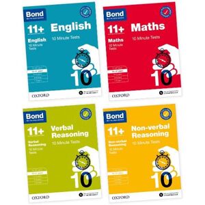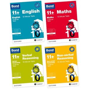 Titles In The Set: 1. English 10 Minute Test 2. Maths 10 Minute Test 3. Verbal Reasoning 10 Minute Test 4. Non-verbal Reasoning Description: Bite-sized practice to help your child succeed at the 11+ and common entrance exam. Bond 10 Minute Tests for 9-10 years cover the core 11+ question types your child will experience in their actual exams, in the four key 11+ subjects of English, Maths, Verbal Reasoning and Non-verbal Reasoning. Each book in this pack includes: targeted skills tests and mixed tests for each subject fun puzzles to reinforce skills a next steps planner visual progress charts for measuring success a pull-out answer section in the centre of each book full answer support to empower parents and children with a greater understanding of the questions.