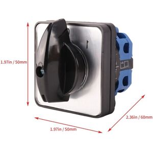 Model Number: SZW26-20/D101.1; Ui: AC 500V Ith: 20A; Rated Voltage (Ue): AC 440V, 240V; Rated Current (Ie): AC-2: 7.5A, AC-3: 5.5A, AC-4: 1.5A, AC-15: 4A, 5A Positions: 1-0-2 (ON/OFF/ON); Terminal Number: 4; Hole Diameter: 3.4mm/0.13inch Body Diameter: 44mm Net Weight: 64.1g When installing universal switch, professional technique is required; The combination switch is mainly suitable for electrical wiring in the power switch and the start of the mouse cage type asynchronous motor, inverter, speed switches, can also carry out the conversion of the control circuit. Color: Black + Blue + Silver Material: Plastic Size: Overall size: 50 x 50 x 60 mm Package Contents: 2 x Switch 8 x Screws Only the above package content, other products are not included. Note: Light reflection and different displays may cause the color of the item in a little different from the real thing. The measurement allowed error is +/- 1-3 cm.