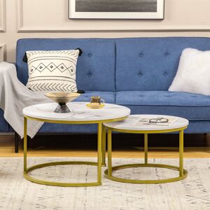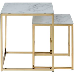 Introducing the Round Nest of Two Tables, a harmonious blend of rustic charm and contemporary elegance, perfect for any living space. This stylish set features solid mango wood tops paired with a luxurious gold metal base, creating a striking contrast that enhances the aesthetic appeal of your home. The larger table stands at 58cm high, with a diameter of 55cm, providing ample surface area for decorative items, beverages, or everyday essentials. The smaller table, designed to nest conveniently beneath the larger one, offers additional surface space when needed while saving space when not in use. This thoughtful design ensures versatility and ease of use, making it an ideal choice for dynamic living environments. Crafted from solid mango wood, the table tops showcase the natural beauty of the wood's grain and rich tones, adding a touch of organic elegance to your décor. Each piece is unique, reflecting the individual character and charm of the wood. The gold metal bases provide a sturdy and stable foundation, with a sleek and sophisticated design that complements the rustic appeal of the wood. One of the standout features of this set is its convenience, as it comes fully assembled and ready to use straight out of the box. The compact dimensions, 55cm wide and 55cm deep, make these tables a perfect fit for a variety of spaces, from cozy apartments to spacious living rooms. Whether used together or separately, the Round Nest of Two Tables is a practical and stylish addition to your home, offering both functionality and aesthetic appeal. Enhance your living space with this elegant and versatile set, and enjoy the perfect blend of natural beauty and contemporary design. Fairmont Park Colour: Dark Oak/Gold