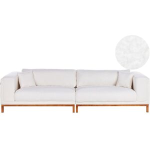 Modern Couch with Wooden Legs. Add comfort and style to your living area with this four-seater sofa. Upholstered in durable and soft boucle fabric, it offers thick, comfortable cushions, while its wooden legs guarantee stability and complement the off-white colour. This piece is a perfect addition to any modern or traditional interior setting. Details: Product Type: 4 Seater Sofa Style: Modern General Color: White, Brown Shade: Off-White Material Type: Fabric Main Material: Boucle Additional Material: Eucalyptus Wood Filling Material: Foam Material Composition: 100% Polyester Arm Style: Track Pattern: Solid Seat Construction: Sinuous Springs Seat Foam Density: 30 kg/m3 Seats Up To: 4 People Dimensions: Armrests Height: 79 cm Depth: 90 cm Seat Thickness: 22 cm Seat Height: 46 cm Width: 308 cm Height: 79 cm Seating Surface: 83x252 cm Weight: 118 kg Weight Capacity per Person: 150 kg Offer Includes: 1 x Sofa, 2 x Scatter Cushion Key Features: Thickly Padded for Utmost Comfort, Great