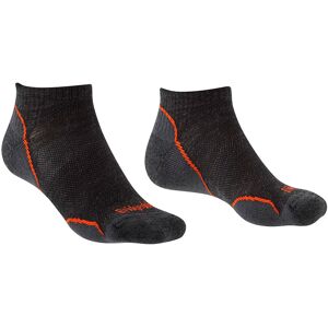 If you are planning on long distance, hot weather adventures, these Men's Bridgedale Hike Ultra Light T2 Merino Performance Crew Socks in Gunmetal tick all the boxes. When the going gets hot, these ultra light socks will ensure your feet stay cool, dry and comfortable thanks to their exceptional moisture wicking and lightweight micro cushioning. Men's Bridgedale Hike Ultra Light T2 Merino crew socks fibre contents: 43% Merino wool, 55% nylon/polyamide, 2% Lycra/elastane. FEATURES - · FUSION TECH MERINO PERFORMANCE - Setting Bridgedale apart from other sock brands, Fusion Technology is a unique blend of yarn and knitting technology that combine the highest quality natural yarns with high performance microfibres. Merino Performance marries the anti-bacterial properties of Merino wool with technical synthetic yarns in a knit that provides a supportive fit, moisture wicking and outstanding durability and comfort. Perfectly suited for long distance walking. · PERFORMANCE FIT - A close and supportive fit is achieved from the Lycra fibre running through every course preventing sock slip and bunching, no matter how long the day. · MOISTURE MANAGEMENT - Transfers moisture away from the skin's surface, keeping feet dry and comfortable. · THERMOFIT - Every Bridgedale sock is Thermo set to ensure a perfect fit. The sock will return to its designed size regardless of how many times it is washed. · FLAT TOE SEAM - The flat seam that closes the toe box is virtually invisible, reducing excess bulk which can cause irritation, resulting in a more comfortable fit. · FORWARD FLEX - Keeps the sock from bunching under the tongue of the boot/shoe for added comfort. · OVERFOOT VENTILATION - Moisture is easily transported away from the foot and insulation is reduced thanks to Bridgedale's open mesh structure. · SHOCKZONES - Extra comfort to areas of the foot and leg is provided by the advanced zonal padding system. · T2 ANTI-SHOCK CUSHIONING - For all day long comfort, a loop within a loop provid es an additional level of impact protection. · Y-HEEL - A 3D shaped heel cup helps ensure comfort by reducing excess bulk and slippage. Bridgedale socks are guaranteed for their lifetime against faults in workmanship and materials.