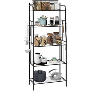 Storage and style for the kitchen, with this HOMCOM shelving unit. It showcases five mesh shelves, offering plenty of space for all kitchen essentials. The four hooks provide extra room on the side, and can be moved to where you wish for complete versatility. The steel frame means a strong structure for full support, complete with adjustable feet and included anti-tipping straps. HOMCOM 5 Tier Microwave Stand Coffee Bar Station with Storage Shelves 4 Hooks in Black